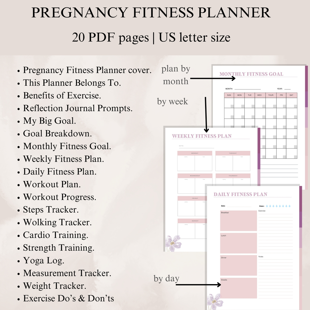 This comprehensive pregnancy fitness planner is your one-stop guide to staying active, healthy, and confident throughout your first trimester and beyond!