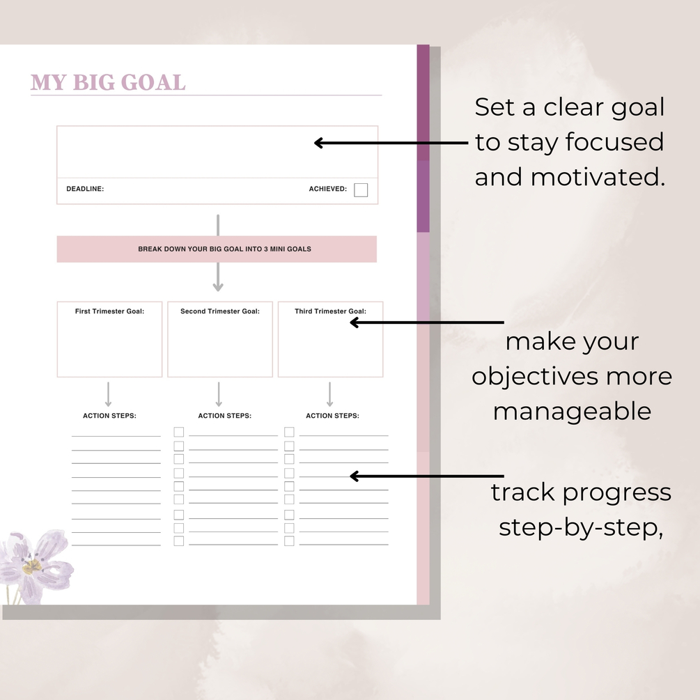 • Goal Breakdown: Break down your big goal into smaller, achievable milestones for each trimester.